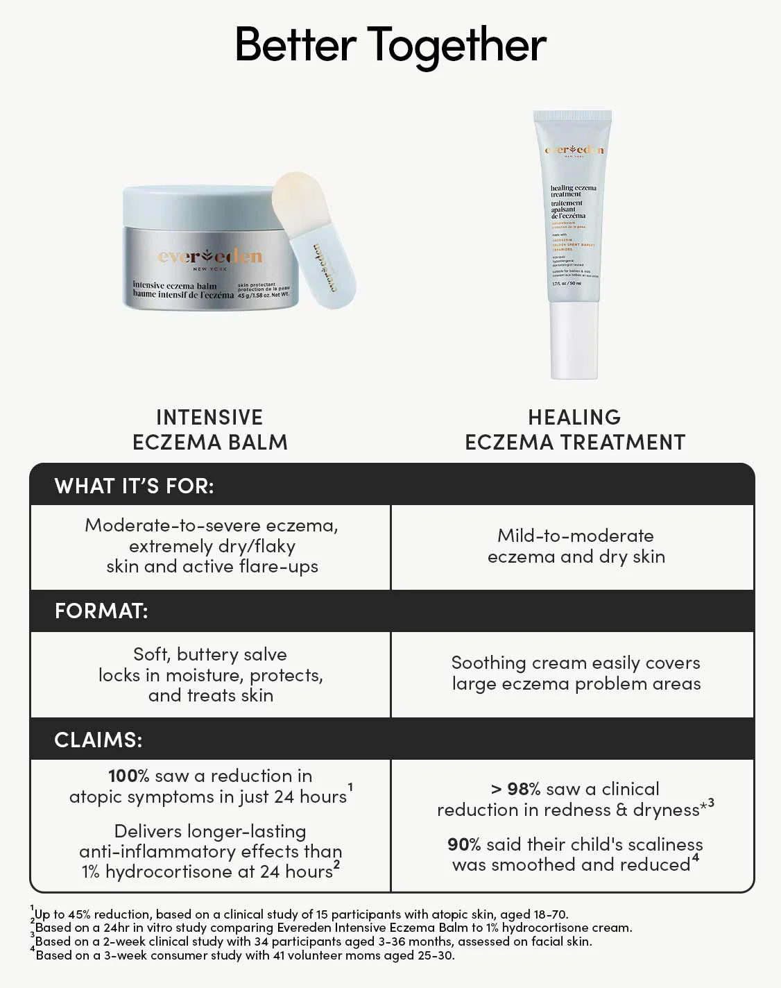 This dynamic duo is designed to cover the full spectrum of eczema care, providing solutions for both moderate-to-severe flare-ups and daily maintenance. The Intensive Eczema Balm provides targeted relief and protection for extreme dryness and active flare-ups, and the Healing Eczema Treatment delivers soothing hydration and itch relief for chronic dry skin and mild-to-moderate eczema.